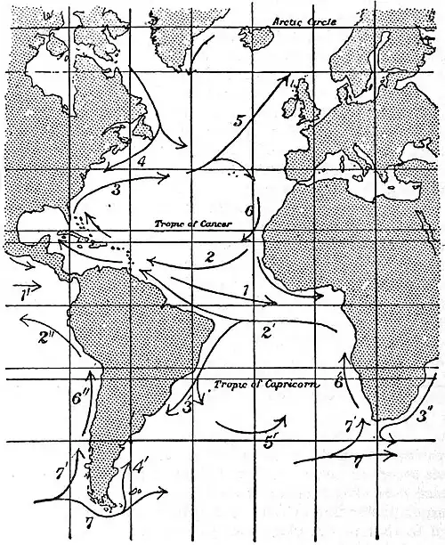 Fig. 1.—Diagram of the Atlantic Ocean, showing the Main Surface Currents (some are seasonal only): the corresponding Indian and Pacific currents are cited in parentheses; they are rarely so strongly marked as in the Atlantic. | |