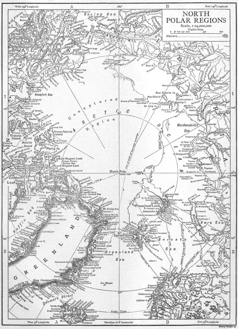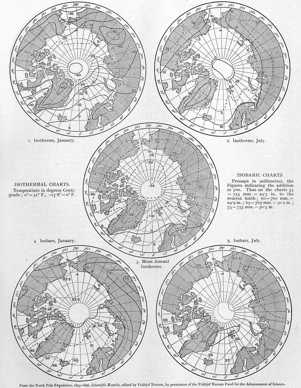 Bibliography.—For very full references to polar exploration see A. W. Greely, Handbook of Polar Discovery (4th ed., London and New York, 1910), and for a nearly complete bibliography of earlier polar literature see J. Chavanne and others, The Literature of the Polar Regions (Vienna, 1878). W. Scoresby, An Account of the Arctic Regions (2 vols. Edinburgh, 1820), W. E. Parry, Attempt to reach the North Pole (London, 1828); S. Osborn, The Discovery of the North-West Passage (London, 1857); M‘Clintock, A Narrative of the Discovery of the Fate of Sir John Franklin, &c. (London, 1859); G. S. Nares, Voyage to the Polar Sea, 1875–1876 (2 vols., London, 1878), A. H. Markham, The Great Frozen Sea (London, 1878, &c); J. Richardson, The Polar Regions (Edinburgh, 1861); A. v. Middendorff, “Der Golfstrom ostwärts vom Nordkap,” Petermanns Mitteilungen (Gotha, 1871); A. Petermann, “Die Erschliessung eines Theiles des nördlichen Eismeeres . . . im Karischen Meere, 1870,” Petermanns Mitteilungen (1871); and numerous other papers in the same periodical, C. R. Markham, The Threshold of the Unknown Region (London, 1873), Die zweite deutsche Nordpolfahrt unter Führung des Capt. K. Koldewey (2 vols., Leipzig, 1873–1874); Manual of the Natural History, Geology, and Physics of Greenland and the neighbouring Regions, published by the Admiralty (London, 1875); Arctic Geology and Ethnology, published by the Royal Geographical Society (London, 1875), C. Weyprecht, Die Metamorphosen des Polareises (Vienna, 1879); papers on the results of the Austro-Hungarian Expedition, 1872–1874, in Petermanns Mitteilungen (1875, and especially 1878), J. Payer, New Lands within the Arctic Circle (2 vols., London, 1876), E. Bessels, Scientific Results of the US. Arctic Expedition, C. F. Hall commanding, vol. i. (Washington, 1874), Die amerikanische Nordpol-Expedition (Leipzig, 1879), The Norwegian North Atlantic Expedition, 1876–1878, especially H. Mohn, “The North Ocean its Depths, Temperature and Circulation” (Christiania, 1887), and “Chemistry,” by H. Tornöe and L. Schmelck (Christiania, 1880, 1882); A. E. Nordenskiöld, The Voyage of the “Vega” (London, 1881); several reports on the six voyages of the “Willem Barents” in the summers of 1878 to 1883, published in Dutch (Amsterdam and Haarlem, 1879–1887); De Long, The Voyage of the “Jeannette”, the Ship and Ice Journals of George W. De Long (2 vols., London, 1883), Otto Pettersson, “Contributions to the Hydrography of the Siberian Sea,” in Vega-Expeditionens vetenskapliga Iakttagelser, vol. ii. (Stockholm, 1883); Axel Hamberg, “Hydrografisk Kemiska Iakttagelser under den svenska Expeditionen till Grönland, 1883,” Bihang till k. svenska vet.-akad Handlingar, vol. ix. No. 16 and vol. x. No. 13 (Stockholm, 1884 and 1885), O. Krümmel, Handbuch der Ozeanographie (2 vols., Stuttgart, 2nd ed, 1907, &c); C. Ryder, “Den Ostgrönlandske Expedition,” Meddelelser om Grönland, pt. xvii. (Copenhagen, 1895); Isforhldene i Nordhavet 1877–1892, with 10 charts (Copenhagen, 1896); O. Pettersson and G. Ekman, “Die hydrographischen Verhältnisse der oberen Wasserschichten des nördlichen Nordmeeres zwischen Spitzbergen, Grönland und der norwegischen Küste in den Jahren 1896 und 1897,” Bihang till der K. Svenska Vet -Akad. handlingar, vol. xxiii. pt. ii. No. 4, The Danish Ingolf Expedition; see especially M. Knudsen, “Hydrography,” in vol. i. (Copenhagen, 1899), F. Nansen, Farthest North (2 vols., London, 1897), The Norwegian North Polar Expedition, 1893–1896: Scientific Results; see especially F. Nansen, “The Oceanography of the North Polar Basin,” in vol. ii. No. 9; “Some Results of the Norwegian Arctic Expedition, 1893–1896,” Geographical Journal (London, May 1897). By V. Garde and others there are, since 1895, yearly reports with charts of the state of the ice of the Arctic seas, in the Nautical-Meteorological Annual of the Danish Meteorological Institute (Copenhagen) Several Russian papers in various Russian periodicals, e.g. N. Knipovitch, “Material concerning the Hydrology of the White Sea and the Murman Sea,” Bulletin de l’académie imp. des sciences de St Pétersbourg (October 1897); Prince B. Galitzin, “On the Extension of the Gulf Stream in the Arctic Ocean,” ibid. (November 1898, both in Russian), &c.; N. Knipovitch, “Hydrologische Untersuchungen im europaischen Eismeer,” Ann. d. Hydr u. marit. Meteorolog. (1905), Filip Akerblom, “Recherches océanographiques Expedition de M. A. G. Nathorst en 1899,” Upsala Univesitets Arsskrift (1903). Math. och Naturvetenskap II. (Upsala, 1904); Axel Hamberg, “Hydrographische Arbeiten der von A. G. Nathorst geleiteten schwedischen Polarexpedition 1898,” Kongl. svenska vet -akad. Handlingar, vol. xli. No. 1 (Stockholm, 1906), F. Nansen, “Northern Waters,” Videnskabs Selskabets Skrifter, vol. i. No. 3 (Christiania, 1906); B. Helland-Hansen and F. Nansen, “The Norwegian Sea,” Report on Norwegian Fishery and Marine Investigations, vol. ii. No. 2 (Bergen, 1909); Duc d’Orléans, Croisière océanographique dans la Mer du Grönland en 1905 (Brussels, 1909), see especially B. Helland-Hansen and E. Koefoed, Hydrographie. (H. R. M.; F. N.)