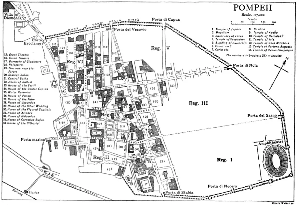 The general plan of the town is very regular, the streets being generally straight, and crossing one another at right angles or nearly so. But exceptions are found on the west in the street leading from the Porta Ercolanese (gate of Herculaneum) to the forum, which, though it must have been one of the principal thoroughfares in the city, was crooked and irregular, as well as very narrow, in some parts not exceeding 12 to 14 ft. in width, including the raised footpaths on each side, which occupy a. considerable part of the space, so that the carriage-way could only have admitted of the passage of one vehicle at a time. The explanation is that it follows the line of the demolished city wall. Another exception is to be found in the Strada Stabiana (Stabian Street) or Cardo, which, owing to the existence of a natural depression which affects also the line of the street just east of it, is not parallel to the other north and south streets. The other main streets are in some cases broader, but rarely exceed 20 ft. in width, and the broadest yet found is about 32, while the back streets running parallel to the main lines are only about 14 ft. (It is to be remembered, however, that the standard width of a Roman highroad in the neighbourhood of Rome itself is about 14 ft.) They are uniformly paved with large polygonal blocks of hard basaltic lava, fitted very closely together, though now in many cases marked with deep ruts from the passage of vehicles in ancient times. They are also in all cases bordered by raised footways on both sides, paved in a similar manner; and for the convenience of foot-passengers, which was evidently a more important consideration than the obstacle which the arrangement presented to the passage of vehicles, which indeed were probably only allowed for goods traffic, these are connected from place to place by stepping-stones raised above the level of the carriage-way. In other respects they must have resembled those of Oriental cities—the living apartments all opening towards the interior, and showing only blank walls towards the street; while the windows were generally to be found only in the upper storey, and were in all cases small and insignificant, without any attempt at architectural effect. In some instances indeed the monotony of their external appearance was broken by small shops, occupying the front of the principal houses, and let off separately; these were in some cases numerous enough to form a continuous façade to the street. This is seen especially in the case of the street from the Porta Ercolanese to the forum and the Strada Stabiana (or Cardo), both of which were among the most frequented thoroughfares. The streets were also diversified by fountains, small water-towers and reservoirs (of which an especially interesting example was found in 1902 close to the Porta del Vesuvio) and street shrines. The source of the water-supply is unknown.