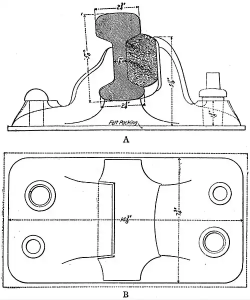Fig. 10—A, Section of British Bull-Headed Rail, 90 ℔ to the yard, showing also chair and fastenings. B, Plan of Chair. |
