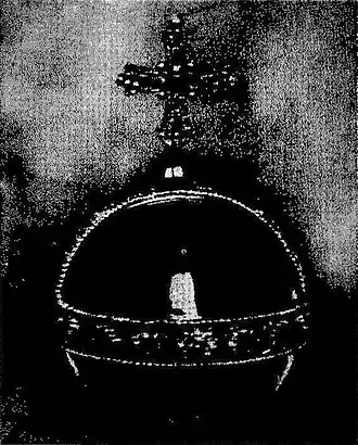 The orb and cross was not anciently placed in the king’s hands during the coronation ceremony, but was carried by him in the left hand on leaving the church. It is emblematical of monarchical rule, and is only used by a reigning sovereign. The idea is undoubtedly derived from the globe with the figure of Victory with which the Roman emperors are depicted. The larger orb of the English regalia is a magnificent ball of gold, 6 in. in diameter, with a band round the centre edged with gems and pearls. A similar band arches the globe, on the top of which is a remarkably fine amethyst 11/2 in. in height, upon which rests the cross of gold outlined with diamonds. There is a smaller orb made for Mary II., who reigned jointly with King William III.