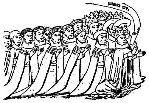 - ↑ “Longues cottes vertes a estroictes manches fourres de menever, et chapperons pareil fourres de menever, en guise de prelats; et avoient les dits chevaliers sur la senestre espaule ung double cordeau de soye blanche a blanche houppettes pendans” (Froissart).