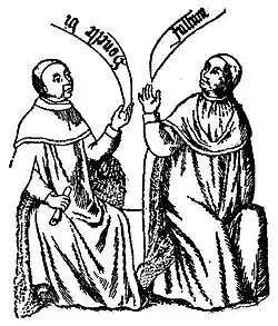 - ↑ Clark (pp. 138-39) treats of the palhlurn and tabard as two separate garments, deciding that the pallium was a kind of tippet. Robinson considers the pallium to correspond to the tabard, his taberdum talare, which the Rev. T. A. Lacey (p. 128) also compares with the chimere of Anglican bishops. (See article CHIMERE, where the chimere is likewise traced to the tabard.) Moroni, Dizionario dell erudizione storica-ecclesiaslica, s.v. zimarra, says that professors of the university of Rome wear black zimarre while teaching. This recalls the pallium of Regent Masters (Mun. Acad. p. 421) and Inceptors in arts and medicine (id. p. 430).