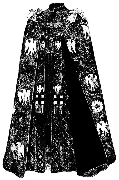 The coronation robes of emperors and kings, representing as they, do the sacerdotal significance of Christian kingship, are essentially vestments rather than robes (see Coronation). Apart from these, however, are the royal robes of state; in the case of the king of England a crimson velvet surcoat and long mantle, fastened in front of the neck, ermine lined, with a deep cape or tippet of ermine.[1]