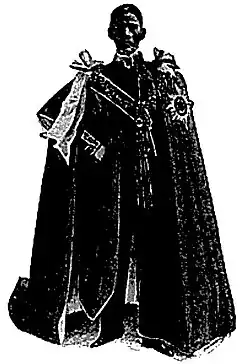 The robes worn by the knights of the Bath created at the Coronation of Henry IV. were green with furred hoods, and a white silk cord hanging from the left shoulder.[5] In the various accounts of later creations of knights of the Bath quoted by Anstis, the costume worn before the ceremonial bath seems to have been a priest-like garment of russet or grey, with a girdle and hood; after the bath, was put on a red surcoat and mantle, the latter with a lace of white silk, from which hung a pair of white gloves; and the final costume was a blue (later a purple) velvet or satin gown, with hood furred with miniver (later lined with sarcenet), and the white cord hanging from the shoulder, until it should be removed by the sovereign or a lady for some deed of valour. The mantle in the present day is of crimson velvet lined with white over a white satin under-coat and trunk-hose, and~, a plumed hat and white boots with red tops are worn. The mantle of the Thistle is of dark green velvet over surcoat, &c., of cloth of silver; that of St Patrick azure, with doublet and trunk-hose of white satin; that of St Michael and St George of Saxon blue satin lined with scarlet; and that of the Star of India of light blue satin lined with white.