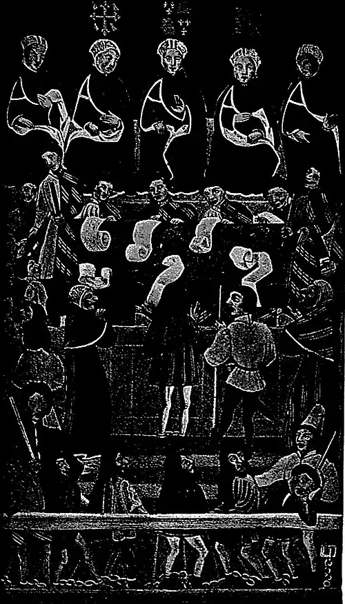 - ↑ The Chandler MS. The drawings from which the illustration is taken are reproduced in the Transactions of the St Paul’s Ecclesialogical Society, p. 208, with an explanatory article by the Rev. N. F. Robinson, and in Archaeologia, vol. liii. pl. i., with notes by T. F. Kirby. Robinson identifies the various groups of the Society of New College on his plate i. (xv. in Archaeol.) by the aid of a statute of the College settling the order of standing in choir and at processions, and thus claims to settle the question of the dress of the various kinds of Doctor and Bachelor, M.A.’s, &c., at the period.