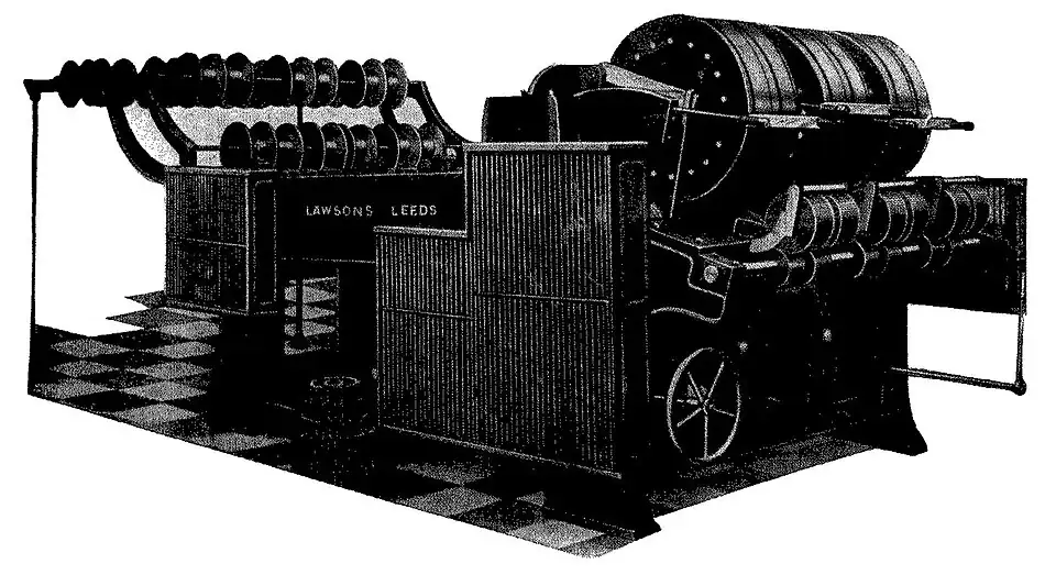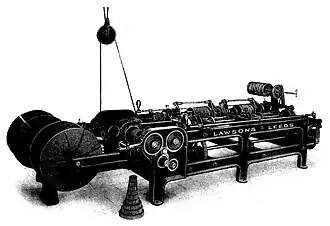 In general, three such machines are used for the process; the pins in the gill-sheets are graded, those in the second machine being finer and more closely set than those in the first machine, while a still finer and closer arrangement obtains in the third machine. The slivers from the third hackling and spreading machine are now placed at the back of the first drawing frame, one type of which appears in fig. 12, Plate II. Each sliver is passed separately over a guide pulley, led upon the pins, drawn out and joined by others, and finally delivered as a sliver ready for the second drawing frame. A similar process is carried on in this machine, from which the sliver emerges ready for the spinning frame. It will thus be seen that a system of doubling, as well as of drawing, obtains in these processes as in flax-preparing; such a system is adopted in order to obtain uniformity of sliver and the correct weight.