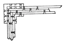 It is about this period (1860–1870), perhaps the most important in the history of safes, that the opening of safes by wedges seems to have become prominent. The effect of wedges was to bend out the side of the safe sufficiently to allow of the insertion of a crowbar between the body and the edge of the door, and various devices were adopted by different makers with the object of resisting this mode of attack. These devices may be placed in three classes: (1) the fixing to the door of studs or projections which, when the door closed, passed into holes or recesses in the frame of the body; (2) the use of bolts hooking into the side framing or entering the bolt holes at an angle; (3) the strengthening of the side framing and of the attachment of the bolts to the outer door-plate. The third of these methods (fig. 2) was patented' by Samuel Chatwood in 1862, and is still very commonly employed. The second method was used by»Chubb and Chatwood, but is not today in general use. The first method was used by all makers of repute, but has now been abandoned, as the increased structural strength of the better class of safes renders such devices unnecessary.
