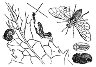 SAW-FLY, the name given to the members of a well-known subdivision (Symphyta) of the Hymenoptera characterized by possessing a sessile abdomen which hides the base of the posterior legs. The antennae vary in their structure and in the number of their joints. Two of the processes of the ovipositor are modified to form saws, which when at rest lie in a sheath formed of two other processes which are modified into protective structures or valves. The larvae are usually caterpillars, but may be distinguished from the caterpillars of Lepidoptera (moths and butterflies) by the greater number of their abdominal pro-legs; usually 6, to 8 pairs are present. When alarmed they roll themselves up in a spiral fashion; some also discharge a thin fluid from lateral pores situated above the spiracles. The females place their eggs in small incisions made by means of their saws in the soft parts of leaves. Usually one egg is placed in each slit. Some species merely attach their eggs in strings to the exterior of the leaves. With each incision a drop of fluid is usually excreted, which serves to excite a flow of sap to the wounded part. The egg is said to absorb this sap, and so to increase in size. One genus (Nematus) alone forms galls. These occur in the young leaves of the willow, a tree which the true gall-flies do not attack. Nematus ventricosus resembles the bees and wasps in the fact that the parthenogenetic ova produce only males; as a rule in the animal kingdom the absence of fertilization results in the production of females.