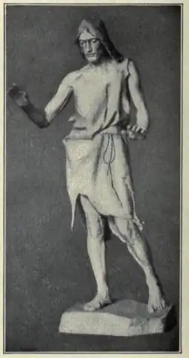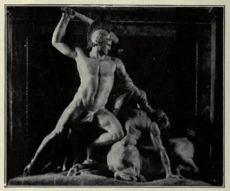 The early names in American sculpture-Shem Drowne, the maker of weather-vanes; Patience Wright (1725–1785); William United Rush (1765–1833), carver of portraits and of figure-heads for ships; John Frazer (1790–1850), the stone cutter; and Hezekiah Augur (1791–1858)—have the interest of chronicle at least. Hiram Powers (1805–1873) had a certain technical skill, and his statues of the “Greek Slave” (carved in 1843 in Rome and now at Raby castle, Darlington, the seat of Lord Barnard, with a replica at the Corcoran Gallery, Washington, and others elsewhere) and “Eve before the Fall” were important agents in overcoming the Puritanic abhorrence of the nude. Horatio Greenough (1805–1852), Joel T. Hart (1810–1877), S. V. Clevenger (1812–1843) and Clark Mills (1815–1883) all received many commissions but made no additions to the advancement of a true art-spirit. Thomas Crawford (1814–1857) began the bas-reliefs for the bronze doors of the Capitol, and they were finished by William H. Rinehart (1825–1874), whose “Latona” has considerable grace. Henry Kirke Brown (1814—1886) achieved, among less noteworthy works, the heroic “Washington” in Union Square, New York City. It is one of the noblest of equestrian statues in America, both in breadth and certainty of handling and in actual majesty, and reliects unwonted credit on its' period. Erastus D. Palmer (1817–1904) was the first to introduce the lyrical note into American sculpture; his statue, “The White Captive,” and still more his relief, “Peace in Bondage,” may be named in proof. There is undeniable skill, which yet lacks the highest qualities, in the work of Thomas Ball (b. 1819). William Wetmore Story (1819–1896), whose “ Cleopatra,” though cold, shows power; Randolph Rogers (1825–1892), best known for his blind “Nydia,” and for his bronze doors of the Capitol at Washington; John Rogers (1829–1904), who struck out a new line in actuality, mainly of an anecdotal military kind; Harriet Hosmer (1830–1908), a classicist, whose recumbent “Beatrice Cenci” is perhaps her most graceful work; J. S. Hartley (b. 1845); Launt Thompson (1833–1894) are among the leaders of their day. The works of Olin L. Warner (1844–1896) and J. Q. A. Ward (1830–1910) reveal at times far greater originality than any of these. Warner’s two graceful classical igures for a fountain in Portland, Oregon, and his admirable portrait statue of William Lloyd Garrison, reveal a nice discernment of the fitness of manner to matter. He was also successful in modelling medallions. Ward has a sturdiness, dignity, and individuality quite his own, and may be considered at the head of his own generation. In addition to these should be mentioned Larkin G. Mead (b. 1835), George Bissell (b. 1839), Franklin Simmons (b. 1839), Martin Milmore (1844–1883), Howard Roberts (1843–1900), Moses Ezekiel (b. 1844), 'all of whom are prominent in the history and development of sculpture in America. By their time the sculptors of America had wakened completely, artistically speaking, to a sense of their own nationality.