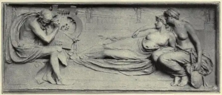 It was however later that came that inspired modernity, that sympathy with the present, which are in some senses vital to genuinely emotional art. American sculpture, like American painting, was awakened by French example. The leading spirit in the new movement was Augustus St Gaudens (q.v.), a great sculptor whose work is sufficiently dealt with in the separate article devoted to him. Two other Americans stand out, with St Gaudens, among their contemporaries, Daniel Chester French (q.v.) and Frederick Macmonnies (q.v.). French’s “Gallaudet teaching a Deaf Mute” is an example of how a difficult subject can be turned into a triumph of grace. His “Death and the Young Sculptor” is a singularly beautiful rendering of the idea of the intervention of death. In collaboration with E. C. Potter he modelled various important groups, particularly “Indian Corn” and the equestrian “Washington,” in Paris. The “Bacchante” of Macmonnies, instinct with Renaissance feeling, is a triumph of modelling and of joyous humour; while his statue of “Nathan Hale” in City Hall Park, New York, his “Horse Tamers,” and his triumphal arch decorations for the Soldiers' and Sailors' Memorial at Brooklyn, show the artist’s power in the treatment of a serious theme.