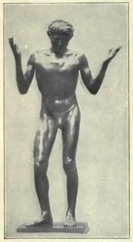 Like Hellmer and Weyr, Victor Tilgner (1844–1896) was a pupil of F. Bauer; but he owed his training rather to Joseph von Gasser and Daniel Boehm. He produced a vast number of portrait busts of his most prominent contemporaries in Vienna. Among his most notable monuments are those to Mozart and Makart in Vienna, the Werndl figure at Steyr, Bürgermeister Petersen in Hamburg, and a war memorial at Königgrätz, in addition to numerous monumental fountains. Artistically on a higher plane than Tilgner stands Arthur Strasser (b. 1854), who excelled in polychromatic work on a small scale. In the ’seventies his Japanese figures excited considerable interest and attracted Makart’s attention. He excelled in Egyptian and Indian genre figures, such as a praying Hindu between two elephants. An Arab leaning against a Sphinx and a classic female figure with a funeral torch were strikingly decorative. His green patined bronze of “The Triumph of Antinous” with a team of lions was awarded a first medal at the Paris Exhibition of 1900.
