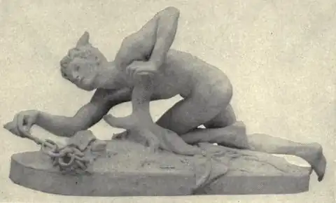 Few men have exercised such influence upon Belgian sculpture as Ief Lambeaux (1852–1908), the Flemish artist. He was born at Antwerp of (poor and obscure parents. At an early age he showed great aptitu e for drawing, and after a very meagre education he was apprenticed to a wood carver. While there he studied at the academy schools. At sixteen he completed his course and undertook his first important commission, that for two reliefs for the tympana of the French theatre. He was successful for a time in producing statuettes, but after a while his success waned and he was obliged to abandon sculpture and to take any work he could get. After a period devoted to odd employments—sometimes painting, sometimes modelling—he again saved money to enable him to produce some good works. The first of these, “The Kiss,” was finished in 1880. It had a great success and was bought by the Antwerp Museum. This discovery of a sculptor of talent led the town of Antwerp to find the means for sending Lambeaux to Italy. After studying in Florence he returned to produce “La Folle Chanson,” which by some is considered his masterpiece. The group of “Intoxication” produced later is less satisfactory. The figures show a curious and unpleasant development which the sculptor’s previous work scarcely hinted at. A work which may be placed with his “Folle Chanson” is the “Fountain of Brabo” in front of the Hôtel de Ville at Antwerp. This in fact is declared by many critics to be Lambeaux’s chef-d’œuvre; it is certainly his most imposing monument. Other works of his are “The Robber of the Eagle’s Nest,” the wonderful colossal glief, “The Passions of Humanity,” “The Wrestlers” and “The Orgy.”