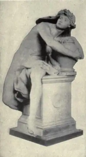 For some years the activity amongst what may be called the Sicilian group of sculptors was headed b Benedetto Civiletti (b. Palermo, 1846). Civiletti was a pupil of Dupré, but his work bears little impress of his master’s influence; it is characterized mostly by its force and meaning of gesture and facial expression. His statue of “The Youth Dante” at the moment of the first meeting with Beatrice, and his seated figure of “The Young Caesar” are both works which successfully show his power of ose and facial expression. He is the author also of the famous Canaris group, “Christ in Gethsemane,” “The Dead Christ,” a group of the siege of Missolonghi, and a group of seventeen life-size figures representing the last stand of the Italians at the massacre of Dogali.
