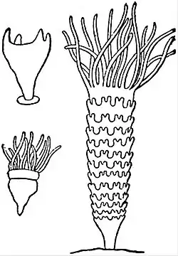 Fig. 12.—Development of Aurelia. Above to left, young scyphistoma with four perradial tentacles. Below to left, scyphistoma with sixteen tentacles and first constriction. To the right, strobila condition of the scyphistoma, consisting of thirteen metameric segments; the uppermost still possesses the sixteen tentacles of the scyphistoma; the remainder have no tentacles, but are ephyrae, each with eight bifid arms (processes of the disc). Each segment when detached becomes an ephyra, such as that drawn in fig. 11, E, F. (From Gegenbaur.) |