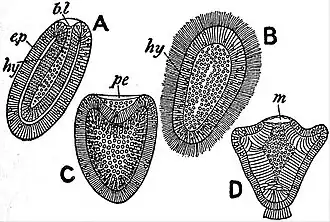 The ovum undergoes total cleavage, giving rise to a bastula which forms a gastrula (fig. 10, A) by invagination (see article Hydrozoa) This is a type of germ-layer formation never found in the Hydromedusae, though of universal occurrence in all groups of animals above the Coelentera. We may regard it as a form of unipolar immigration in which the immigrating cells pass into the interior in a connected epithelial layer, instead of going in singly and independently. The embryo is set free as a planula larva (fig. 10, B) in the gastrula stage, and the orifice of invagination or blastopore, which persists, is situated at the hinder pole. After a time the planula fixes itself by the anterior pole, with the blastopore uppermost. The larva after fixation changes into a polyp-like organism termed a scyphistoma or scyphopolyp (fig. 10, C, D). The body becomes in shape like a vase or urn attached by a narrow stalk, round which a chitinous membrane is secreted. From the edges of the vase the four primary tentacles grow out, each a slender filament with a solid endodermal axis. The tentacles border a broad, flattened peristome, from the centre of which arises the hypostome with the mouth at its extremity; the hypostome is at first low, but soon becomes a projecting, chimney-like tube. It has been sought to prove that the interior of the hypostome is lined by ectoderm, so as to form a stomodaeum or ectodermal oesophagus similar to that of the Anthozoa, but this has been disproved by the most recent investigations of Hein (4) and Friedemann (3), who have shown that the mouth at the extremity of the hypostome represents the persistent blastopore of the gastrula stage.