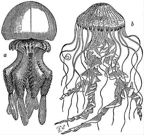 Fig. 3.—Scyphomedusae. a, Rhizostoma pulmo; b, Chrysaora hysoscella. |
