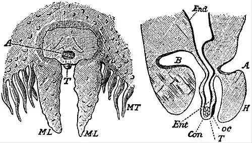 | Ent, | Canal of the enteric system continued into the tentaculocyst. |