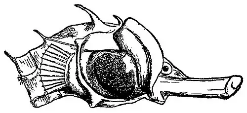 SEA-HORSE. Sea-horses (Hippocampina) are small marine fishes which, with pipe-fishes (Syngnathina), form the Lophobranchiate division of the suborder Thoracostei. The gills of the members 'of this group are not arranged in leaf-like series as in other fishes, but form a convex mass composed of small rounded lobes attached to the bronchial arches, as shown in the accompanying figure (fig. 1) of the head of a sea-horse, in which the gill-cover has been pushed aside to show the interior of the gill-cavity.