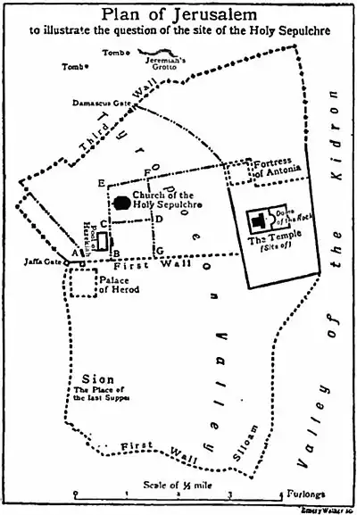 SEPULCHRE, THE HOLY, the tomb in which, after His crucifixion, the body of Jesus Christ was laid. Although the facts of the crucifixion and of the interment of the body of Christ in the tomb of Joseph of Arimathea are related in the New Testament with considerable detail, sufficient indications are not supplied to locate the actual position of the tomb with reference to the city of Jerusalem. It would appear that Golgotha, the place of crucifixion, was outside the city, near a public thoroughfare leading to one of the gates, and visible from some distance. There is, however, no reason for supposing that it was a hill, and the expression “Mount Golgotha” was not used until some centuries later. Adjoining the place Golgotha was a garden, in which was a new rock-cut tomb, the property of Joseph of Arimathea. Rock-cut tombs were common in the vicinity of Jerusalem, as, in consequence of the geological formation, the faces of the hills are frequently broken by low cliffs with terraces between. The comparatively level terraces were used for cultivation while the tombs were excavated in the rock faces. Many instances of tombs so situated can be seen on the hillsides near Jerusalem, and it is not unreasonable to suppose that the tomb of Joseph was of a similar character. As it was outside the city, the question of the validity of the traditional site, upon which the church of the Holy Sepulchre now stands, necessarily depends, to a great extent, upon whether this place was within or without the walls at the date of the crucifixion. At that time, it is clear, judging from the careful description written by Josephus a few years later, that Jerusalem was defended by two walls, as the third wall was not begun by King Herod Agrippa until A.D. 41. Of these, the first, or old wall, ran from the palace of Herod the Great, which was situated at the N.W. corner of the city, and, following an easterly direction, crossed the Tyropoeon Valley and terminated at the west wall of the Temple enclosure. On the other hand, going south from Herod’s palace, it encircled the city on the west and south, and then turning at Siloam it followed the direction of the Kidron Valley and ended at the east wall of the Temple enclosure.