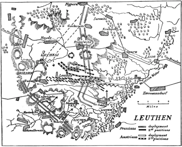 Covered by the low rolling hillocks of the district, the army now moved off to its right across the Austrian front, the advance led by Zieten and half the cavalry, the rear covered by Driessen with the remaining half—some 40 weak squadrons. The infantry having gained a position sufficiently on the Austrian flank, now wheeled into line and attacked inLeuthen. échelon of battalions from the right. The battle soon became desperate, and the Austrian cavalry on their right wing under Luchesi, unaware of Driessen’s presence as a flank guard, issued out of their lines, wheeled to their left and swept down upon the refused flank of the Prussian infantry; but they never reached them, for Driessen, seizing his opportunity, set his squadrons in motion and attacked. The Austrians, completely surprised, were ridden down and driven back on to the front of their own infantry, and the pressure of the fugitives threw the rear of their left wing into confusion and in a short time the ruin of their army was completed. When the news of Driessen’s charge was brought to the king his astonishment was expressed in the single phrase, “What, that old fool Driessen?” The fighting, however, had been desperate, and though the Austrians out of their 72,000 lost 37% including 20,000 prisoners, with 116 guns and 51 colours, the Prussians lost 6200 (14%) making with the other battles of the year a total of nearly 75,000 men, and not including losses in minor skirmishes and on the march.