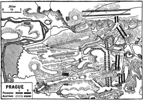 Campaign of 1757.—The Coalition had undertaken to provide 500,000 men against Prussia, but at the beginning of the year only 132,000 Austrians stood ready for action in northern Bohemia. Against these the king was organizing some 250,000, 45,000 of whom were paid for by British subsidies and disposed to cover Hanover from a Battle of Prague.French attack. After leaving detachments to guard his other frontiers, Frederick was able to take the field with nearly 150,000 men, but these also were scattered to guard a frontier some 200 m. in length—the left wing in Silesia under Schwerin and the duke of Brunswick-Bevern, the centre and right under the king. In April the operations began. Schwerin and Bevern crossed the mountains into Bohemia and united at Jung Bunzlau, the Austrians falling back before them and surrendering their magazines. The king marched from Pirna and Prince Maurice of Dessau from Zwickau on Prague, at which point the various Austrian commands were ordered to concentrate. On the morning of the 5th the whole army, except a column under Field Marshal Daun, was united here under Prince Charles of Lorraine, and the king, realizing the impossibility of storming the heights before him, left a corps under Keith and a few detachments to watch Prague and the fords across the river, and marched during the night upstream and, crossing above the Austrian right, formed his army (about 64,000) for attack at right angles to the Austrian front. The ground had not been reconnoitred, and in the morning mist many mistakes in the deployment had been made, but as Daun was known to be but 20 m. away and the Austrian army was changing its front to meet the unexpected attack, the king threw caution to the winds and sending Zieten with his cavalry by a wide détour to cover his left, he ordered the whole to advance. One of the most savage battles in history was the result. Almost immediately the Prussian infantry became entangled in a series of morasses, the battalion guns had to be left behind and the troops had to correct their alignment under the round shot fired by the Austrians, who had completed their change of front in time and now stood ready to sweep the open glacis before them. Before the storm of bullets and the grape and canister of the heavy and battalion guns the Prussian first line faltered and fell in thousands. Their attempts to prepare the way for the bayonet assault broke down. Schwerin was killed. But the second line carried the survivors on, and in the nick of time Zieten’s cavalry drove the Austrian horsemen off the field and broke in on the flank and rear of their infantry. This turned the scale, and the Austrians retreated into Prague in hopeless confusion, leaving some 10,000 men (14·8%) on the ground, and 4275 prisoners, out of about 66,000, in their enemy's hands. The Prussians lost 11,740 men killed and wounded and 1560 prisoners, and in all 20·8% of their strength. The actual fighting seems only to have lasted about two hours, though tiring did not cease till late at night; 16,000 Austrians managed in the confusion to evade capture and join Daun, who made no movement either on this or succeeding days to come to the assistance of his comrades, but began a leisurely retreat towards Vienna.