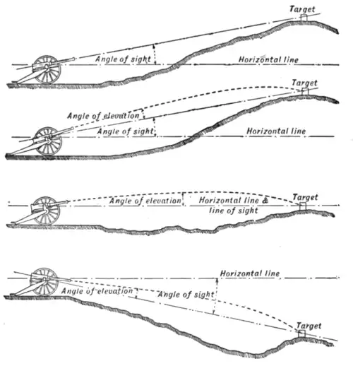 of the mounting, so that the necessity of removing a delicate telescopic sight every round disappeared, and telescope sights on the rocking-bar principle (see below) were introduced for 4·7-in. Q.F. guns on field mountings; these sights admit of continuous laying, i.e. the eye need not be removed when the gun is fired. The increased importance of concealment for one's own guns and the certainty of being called upon to engage concealed targets, brought indirect laying into great prominence (see also Artillery). This form of laying is of two kinds: (1) that in which the gun can be layed for direction over the sight on the target itself, or on some aiming point close by, but from Indirect laying. indistinctness or other causes quadrant elevation is preferred; and (2) that used when the target is completely hidden and an artificial line of fire laid out and the guns layed for direction on pointers, or the line transferred to a distant aiming point. The old method of giving quadrant elevation by clinometer was obviously too slow. Scott's sight (see above) was the first attempt to obtain indirect laying for elevation by means of the sight itself, and in that sight the angle of sight was taken into account; in modern guns this is effected by what is technically called the “independent line of sight” (see Ordnance: Field Equipments). It is obtained by different means in different countries, but the principle is the same. There must be two sets of elevating gears, one which brings the axis of the gun and the sights together on to the target, thus finding the angle of sight and also pointing the axis of the gun at the target, and a second by which, independent of the sight which remains fixed, the elevation due to the range can be given to the gun and read by means of a pointer and dial marked in yards for range. This latter is shown in the Krupp equipment (Plate, fig. 14), in which the sight is attached to the cradle, but does not move with it. The hand-wheel that screws the gun and cradle down at the same time screws the sight up, and vice versa. When the target is completely concealed it is necessary to lay the gun on an aiming point more or less out of the line of fire, or to lay on a “director” with a large amount of deflection, and to align aiming posts with the sights at zero to give the direction of the target, and afterwards perhaps to transfer the line of sight to some other distant object, all of which require a far greater scope of deflection than is afforded by the deflection leaf. In the South African war improvised detachable deflection scales of wood or iron placed over the fore-sight, called gun arcs, were used, but this device was clumsy, inaccurate and insufficient, as it only gave about 30° right or left deflection, and only a sight that admitted of all-round laying could really satisfy the requirements. “The goniometric sight in its simplest form is a circular graduated base plate on which a short telescope or sighted ruler is pivoted. Besides the main graduations there is usually a separate deflection scale” (Bethell). In this form, which is found in British field artillery, the goniometric or dial sight is used for picking up the line of fire. In the pillar sight used in the French 80- and 90-mm. Q.F. guns it is used for laying for direction.