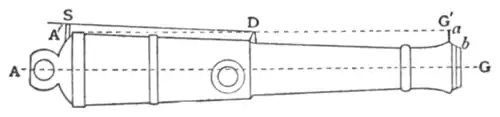 This law holds good also in air for very low velocities, but, where the velocities are high, the retardation is great, the projectile takes longer to traverse each succeeding space, and consequently the time of flight for any range is longer; the axis must therefore be directed still higher above the point to be struck. The amount, however, still depends on the time of flight, as the retardation of the air to the falling velocity may be neglected in the case of flat trajectory guns. Owing to the conical shape of the early muzzle-loading guns, if one trunnion were higher than the other, the "line of metal" would no longer be in the same vertical plane as the axis; in consequence of this, if a gun with, say, one wheel higher than the other were layed by this line, the axis would point off the target to the side of the lower wheel. Further, the inclination of the line of metal to the axis gave the gun a fixed angle of elevation varying from 1° in light guns to 21/4° in the heavier natures. To overcome this a "dispart sight" (D) was introduced (fig. 2) to bring the line of sight (A′DG′) parallel to the axis (AG).