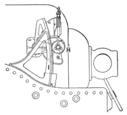 spindle of the hand-wheel gears ; one end of the cross-spindle moves the range drum 2′. The worm and hand-wheel are thrown into and out of gear by means of the clutch t. When the hand-wheel is thrown out of gear the sights can only be moved by means of the elevating gear of the gun. The line of sight and the elevation of the gun henceforth are inseparable. The automatic sight consists of a bent lever roller cam m, also secured by the bolt e to the carrier; the lower end of the lever carries the cam roller n, which is constrained to move in the cam p by means of the spring in the spring-box g; the rear end of the horizontal arm of the lever is formed into jaws v; the same action of the clutch t which releases the worm and hand-wheel forces a catch on a vertical stem u into the jaws of the lever, and fixes the rocking and sight bars rigidly to it. The movement of the sights can now only be effected by means of the elevating gear of the gun, acting by means of the movement of the vertical arm of the bent lever, and its movement is constrained to follow the cam, which is cut in such a way that for any given elevation of the gun the sight bar is depressed to the angle of sight for the range corresponding to the elevation; b′ is a lever for making allowance for state of tide, and c′ is the scale on which the rise and fall in feet above and below mean sea-level are marked. In later patterns, the sight is automatic pure and simple, the lever is rigidly attached to the rocking-bar, and the range scale and gear for raising the sights dispensed with, much as shown in fig. 23. In the larger natures of