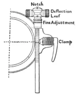 By the same formula it can be shown that 1′ deflection will alter the point of impact by 1 in. for every 100 yds. of range; thus the proper inclination to give a mean correction for drift can be determined. In the early R.B.L. guns this angle was 2° 16′. With rifled guns deflection was also found necessary to allow for effect of wind, difference of level of trunnions, movement of target, and for the purpose of altering the point of impact laterally. This was arranged for by a movable leaf carrying the sighting V, worked by means of a mill-headed screw provided with a scale in degrees and fractions to the same radius as the elevation scale, and an arrowhead for reading. Other improvements were: the gun was sighted on each side, tangent scales dropping into sockets in a sighting ring on the breech, thus enabling a long scale for all ranges to be used, and the foresights screwing into holes or dropping into sockets in the trunnions, thus obviating the fouling of the line of sight, and the damage to which a fixed muzzle sight was liable. The tangent sight was graduated in yards as well as degrees and had also a fuze scale. The degree scale was subdivided to 10′ and a slow-motion screw at the head enabled differences of one minute to be given; a clamping screw and lever were provided (see fig. 7).