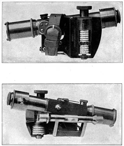 Referring to the calculations given above, this is equivalent to 1′ deflection for every degree of elevation, which amount had to be given towards the higher wheel. This complication is eliminated in Scott's sight by simply levelling the cross axis of the telescope. Other advantages are those common to all telescopic sights. Personal error is to a great extent eliminated, power of vision extended, the sight is self-contained, there is no fore-sight, a fine pointer in the telescope being aligned on the target. It can be equally well used for direct or indirect, forward or back laying. A micrometer drum reads to 2', while the vernier reads to single minutes so that very fine adjustments can be made.