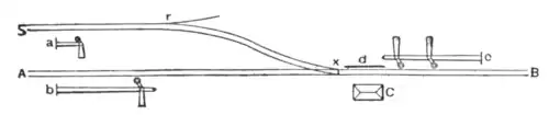 a hundred. The signals (at a, b, and c) are of the semaphore pattern. For the four signals and one pair of points there are, in the second storey of the cabin C, five levers. Each signal arm stands normally in the horizontal position, indicating stop. To permit a train to pass from A to B the signalman moves the arm of signal b to an inclined position (60 degrees to 75 degrees downwards); and the interlocking of the levers prevents this movement unless it can safely be made. If a has been changed to permit a movement from S to B, or if the points x have beeen set for such a movement, or if either signal on post c has been lowered, the lever for b is immovable. In like manner, to incline the arm of signal a for a movement from S to B it is first necessary to have the points set for track S, and to have the levers of all the other signals in the normal (stop) position. A sixth lever, suitably interlocked, works a lock bar, which engages with the head rod of the points; it is connected to the lock through the "detector bar," d. This bar, lying alongside of and close to the rail, must move upwards when the points lock is being moved either to lock or to unlock; and being made of such a length that it is never entirely free of the wheels of any car or engine standing or moving over it, it is held down by the flanges, and the signalman is prevented from inadvertently changing the points when a train is passing. At r is a throw-off or derailing switch ("catch-points"). When x is set for the passage of trains on the main line, r, connected to the same lever, is open; so that if a car, left on the side track unattended, should be accidentally moved from its position, it could not run foul of the main track.