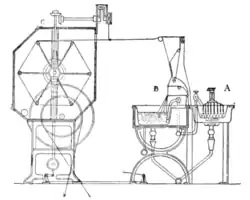Preparing or Drawing Machinery.—A faller or gill drawing machine consists of a long feeding sheet which conveys silk to a pair of rollers (back rollers). These rollers present the silk to a set of fallers (steel bars into which are fixed fine steel pins), which carry forward the silk to another pair of rollers, which draw the silk through the pins of the fallers and present it to the rollers in a continuous way, thus forming a ribbon of silk called a “sliver.” The fallers are travelled forwards by means of screws, and when at the end of the screw are dropped automatically into the thread of a receiving screw fixed below, which carries the fallers back to their starting point to be risen by cams into the top pair of screws thus to repeat their journey.