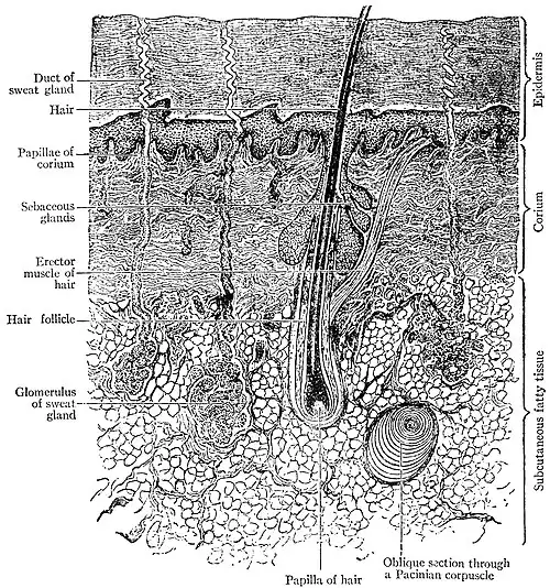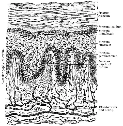 The superficial or papillary layer lies next to the epidermis and is raised into a number of papillae or conical projections which fit into corresponding depressions on the deep surface of the epidermis. In sensitive parts like the palms and soles these papillae are specially prominent and form wavy lines, each of which consists of a double row between which the ducts of the sweat glands pass on their way to the surface. So large are the papillae in these situations that the epidermis is also raised into ridges, and these in the fingers form the characteristic whorls so valuable for purposes of identification. The papillae contain leashes of blood-vessels, and in some of them are special tactile corpuscles in which the nerves end (see Nervous System).