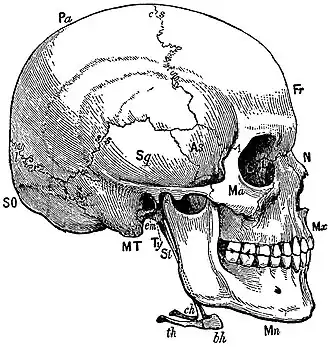 The Skull from the side (norma lateralis). On looking at the accompanying figure (fig. 2) it will be seen that the calvaria or brain case forms all the upper part, while the face is below the anterior half. Taking the calvaria first the side view of the frontal bone (fig. 2, Fr) is seen extending back as far as the coronal suture (cs). just above Fr is an elevation on each side, the frontal eminence, better seen in female than in male skulls. The junction between the frontal and malar (Ma) at the outer margin of the orbit has already been referred to as the external angular process and is an important landmark for measurements, and from it a curved line (the temporal crest) runs back crossing the coronal suture to reach the parietal bone (Pa, fig. 2) ; as it runs back this line divides into two. Below the crossing of the temporal crest the coronal suture is less serrated than above, and here it becomes obliterated first. The quadrilateral outline of the parietal bone is seen as well as its articulations; above it touches its fellow of the opposite side ; in front, the frontal (Fr); below the great wing of the sphenoid or alisphenoid (As), the squamous part of the temporal or squamosal (Sq) and the mastoid part of the temporal (MT), while behind it articulates with the supra-occipital (SO), through the lambdoid suture (ls). All four angles of the parietal are points of special interest; the antero-superior angle or bregma has been already noticed, and it will be seen to lie nearly above the ear opening or external auditory meatus in the temporal bone (em). The antero-inferior angle where the frontal, parietal and alisphenoid meet is the pterion and is the site of an occasional Wormian bone (epipteric) . The posterior superior angle is the lambda and will be better seen on the norma occipitalis, while the posterior inferior angle, where the parietal, supra-occipital, and mastoid temporal bones meet, is known as the asterion and marks the lateral sinus within the cranium. A little above and behind the middle of the parietal bone, and just above the superior temporal crest, is the parietal eminence where ossification starts. The squamous part of the temporal bone overlaps the parietal at the squamous suture, while from its lower part the zygomatic process projects forward to articulate with the malar. At the root of this process is the glenoid cavity where the condyle of the lower jaw articulates, and just behind this the external auditory meatus is seen (em). Behind this again the mastoid temporal is prolonged down into a nipple-shaped swelling, the mastoid process (MT), containing air cells and only found in the adult human skull, while just in front of the external auditory meatus is the styloid process (St), connected with the hyoid bone by the stylo-hyoid ligament (dotted). In the side view of the face the nasal and maxillary bones are seen, and from this point of view it will be noticed that just below the nasal aperture the maxillae, where they join, are produced forward into a little spur, the anterior nasal spine, which is a purely human characteristic. At the side of the maxilla the malar or jugal (Ma) bone is placed, and its lozenge-shaped outline is apparent; it forms the anterior part of the zygomatic arch. When the mandible is disarticulated and removed the posterior part of the maxilla is seen, and behind it the external pterygoid plate of the sphenoid. Between these two bones there is a vertical slit-like opening into a cave, the spheno-maxillary fossa, which communicates with the orbit through the spheno-maxillary fissure, with the nasal cavity through the spheno- palatine foramen, with the cranial cavity through the foramen rotundum, and with the mouth through the posterior palatine canal, as well as having other smaller openings.