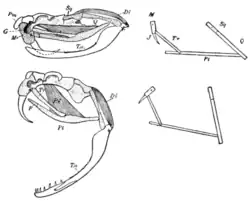 The poison is secreted in modified upper labial glands, or in a pair of large glands which are the homologues of the parotid salivary glands of other animals. For a detailed account see West, J. Linn. Soc. xxv. (1895), p. 419; xxvi. (1898), p. 517; and xxviii. (1900). A duct leads to the furrow or canal of the tooth. The Elapinae have comparatively short fangs, while those of the vipers, especially the crotaline snakes, are much longer, sometimes nearly an inch in length. The Viperidae alone have "erectile" fangs. The mechanism is explained by the diagrams (fig. 4). The poison-bag lies on the side of the head between the eye and the mandibular joint and is held in position by strong ligaments which are attached to this joint and to the maxilla so that the act of opening the jaws and concomitant erection of the fangs automatically squeezes the poison out of the glands.