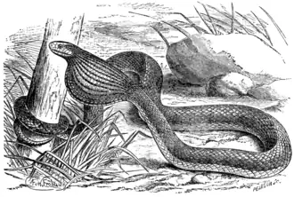 Sub-family 1. Elapinae.—Terrestrial, with a cylindrical tail, comprising about 150 species which have been grouped into numerous genera, mostly upon very slight differences. The most remarkable are the following. Naja tripudians and N. haje, the cobra (q.v.). The largest species is the N. bungarus s. elaps, the "hamadryad," "snake-eating cobra," or king-cobra of Indian countries, reaching more than 12 ft. in length, and living mainly upon other snakes. Sepedon haemachates, of S. Africa, is named by the Boers "roode