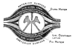 SPINAL CORD, in anatomy, that part of the central nervous system in man which lies in the spinal canal formed by the vertebrae, and reaches from the foramen magnum to the lower margin of the first lumbar vertebra. It is about 18 in. long, and only occupies the upper two-thirds of the spinal canal. The cord is protected by the same three membranes which surround the brain. Outside is the dura mater, which differs from that of the brain in not forming a periosteum not to the bones, in sending no processes inward, and in having no blood sinuses enclosed within its walls. In other words the spinal dura mater is the continuation of only the inner or cerebral layer of the dura mater of the skull. Inside the dura mater is the arachnoid, which is delicate and transparent, while between the two lies the sub-dural space, which reaches down to the second or third sacral vertebra. The pia mater is the innermost covering, and is closely applied to the surface of the cord into the substance of which it sends processes. Between it and the arachnoid is the sub-arachnoid space, which is much larger than the sub-dural and contains the cerebro-spinal fluid. Across this space, on each side of the cord, run a series of processes of the pia mater arranged like the teeth of a saw; by their apices they are attached to the dura mater, while their bases are continuous with the pia mater surrounding the cord. These ligaments, each consisting of twenty-one teeth, are the ligamenta denticulata, and by them the spinal cord is moored in the middle of the cerebro-spinal fluid.