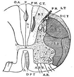On tracing a sensory nerve into the cord (fig. 3, P.R.) through the posterior nerve root it will be seen to lie quite close to the mesial side of the posterior horn of grey matter, where most of it runs upward. The next root higher up takes the same position and pushes the former one toward the middle line, so that the lower nerve fibres occupy an area close to the postero-median fissure known as the tract of Goll (fig. 3, G.T.), while the higher lie more externally in the tract of Burdach (B.T.). The greater part of each nerve sooner or later enters the grey matter and comes into close relation with the cells of Clarke's column, but some fibres run right up to the nucleus gracilis and cuneatus in the medulla (see Brain), while a few turn down and form a descending tract, which, in the upper part of the cord, is situated in the inner part of the tract of Burdach and is known as the comma tract (fig. 3, C.T.), but lower down gradually shifts quite close to the postero-median fissure and forms the oval area of Flechsig (fig. 3, O.A.). It will be obvious that both these tracts could not be seen in the same section, and that fig. 3 is only a diagrammatic outline of their position.