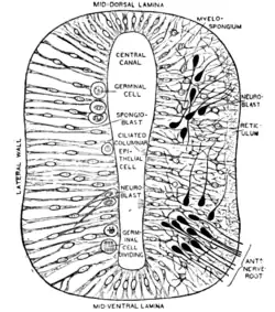 Embryology. - The early development of the neural tube from the ectoderm is outlined in the article on the Brain. When the neural groove becomes a tube it is oval in section with a very large laterally compressed central canal (see fig. 5). The original ectodermal cells elongate and, radiating outward from the canal, are now known as spongioblasts, while the inner ends of some of them bear cilia and so the canal becomes ciliated. A number of round cells, known as germinal cells, now appear close to the central canal, except at the thin mid-dorsal and mid-ventral laminae (roof-plate and floorplate). From the division of these the primitive nerve cells or neuroblasts are formed and these later on migrate from the region of the canal and shoot out long processes - the axons. The permanent central canal of the cord was formerly said only to represent the ventral end of the large embryonic canal, the dorsal part being converted into a slit by the gradual closing in of its lateral walls, thus forming the postero-median fissure. A. Robinson, however, does not believe that the posterior fissure is any remnant of the central canal, and there are many points which bear out his contention (Studies in Anatomy, Owens College, 1891). The most modern view (1908) is that the fissure is formed partly by an infolding and partly from the original central canal. The antero-median fissure is caused by the ventral part of the cord growing on each side, but not in the mid-line where no germinal cells are.