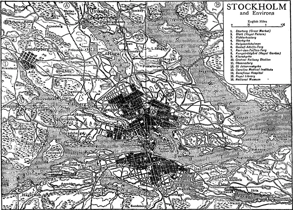 Environs.—The beautiful environment of sea and lake is fully appreciated by the inhabitants. To the north of the city, accessible by rail and water, are the residential suburbs of Haga and Ulriksdal, with royal chateaux, and Djursholm. Saltsjöbaden. 9 m. east of Stockholm, on Baggensfjörd, is the nearest and most favoured seaside resort, but Dalarö (20 m. south-east) and Nynäshamn (39 m. south) are much frequented. Vaxholm, 12 m. north-east by water, is a pleasant fishing-village where numerous villas have been built. A fortification on one of the islands here was erected by Gustavus Vasa, but has been modernized and is maintained.