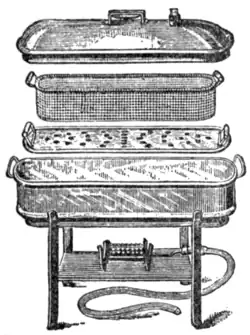 in boiling water, and can be lifted on the tray and transferred straight from the sterilizer into vessels containing sterilized water or antiseptic lotion. For the sterilization of dressings an upper vessel is fitted to the sterilizer, so that the steam may permeate the dressings placed in it. In hospital practice it is used also to sterilize all towels, aprons and the like in a large cylindrical vessel. Sterilization by boiling or steaming, together with the use of antiseptic lotions, or of water that has been boiled, for all such things as cannot be boiled or steamed, is the essential principle of the surgery of the present day; and practically the antiseptic method and the aseptic method have become one, varying a little this way or that according to the nature and circumstances of the case.