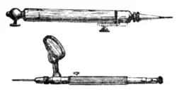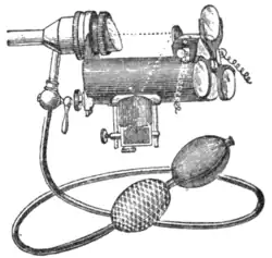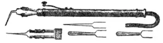 1. The Galvano-Caulery.—The original form of the cautery, the fer ardent of Paré's time, for the arrest of haemorrhage after amputation, was a terrible affair. Happily for mankind his invention of the ligature put an end to this use of the cautery, but it was still used in a small number of other cases. Subsequently Claude André Paquelin (b, 1836) invented a very ingenious form of cautery, a series of metal blades or points of different shapes and sizes, that could be fitted to a handle: these points were hollow inside, and were filled with fine platinum gauze, and, by means of a bottle and hand bellows, they could be kept heated with benzene-vapour. Thus, when they had once been raised to a glowing heat by holding them over a spirit-lamp, they could be kept at any desired heat. This instrument is still in use for a few cases where very rapid and extensive cauterization is necessary. But for all finer use of actual heat the galvano-cautcry alone is used—a series of very minute points of platinum, with a suitable trigger-handle, connected with a battery or (by means of a converter) with the ordinary house supply of electricity. In this way it is possible to apply a glowing point with a fineness and accuracy of adjustment that were wholly impossible with Paquelin's cautery.
