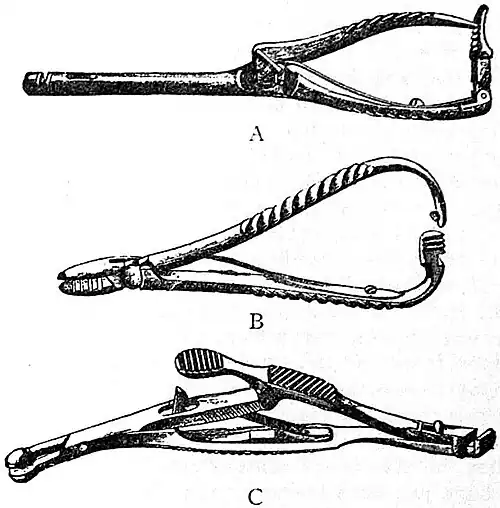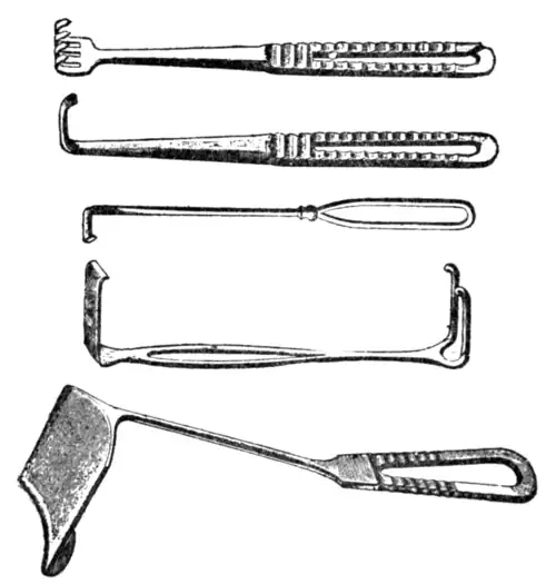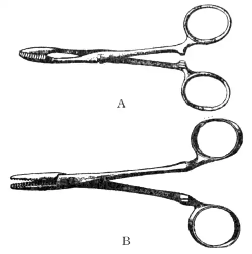 SURGICAL INSTRUMENTS AND APPLIANCES. The purpose of this article is to give an account of the more important surgical instruments that are now in general use, and to show by what modifications, and from what discoveries in science, the present methods of an operation have come to be what they are. The good surgeon is careful to use the right sort and pattern of instrument, and the chief fact about the surgery of the present day, that it is aseptic or antiseptic, is recorded in the make of surgical instruments and in all the installation of an operating-theatre. Take, for instance, a scalpel and a saw that are figured in Ambroise Paré's (1510-1590) surgical writings. The scalpel folds into a handle like an ordinary pocket-knife, which alone was enough in those days to keep it from being aseptic. The handle is most elegantly adorned with a little winged female figure, but it does not commend itself as likely to be surgically clean. The saw, after the same fashion, has a richly chased metal frame, and, at the end of the handle, a lion's head in bold relief, with a ring through its mouth to hang it up by. It may be admirable art, but it would harbour all sorts of germs. If one contrasts with these artistic weapons the instruments of 1850, one finds no such adornment, and for general finish Savigny's instruments would be hard to beat; but the wooden or ivory handles, cut with finely scored lines like the cross-hatching of an engraving, are not more likely to be aseptic than the handles of Paré's instruments. At the present time, instead of such handles as these, with blades riveted into them, scalpels are forged out of one piece of steel, their handles are nickel-plated and perfectly smooth, that they may afford no crevices, and may be boiled and immersed in carbolic lotion without tarnishing or rusting; the scalpel has become just a single, smooth, plain piece of metal, having this one purpose that it shall make an aseptic wound. In the same way the saw is made in one piece, if this be possible; anyhow, it must be, so far as possible, a simple, smooth, unrusting metal instrument, that can be boiled and laid in lotion; it is a foreign body that must be introduced into tissues susceptible of infection, and it must not carry infection with it.