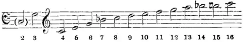 This opinion is shared by Bach, who, in a trumpet solo which ends the cantata “Der Himmel lacht,” wrote up to the twentieth harmonic. So considerable a compass could not be reached by one instrumentalist: the trumpet part had therefore to be divided, and each division was designated by a special name.[7] The part that was called principal went from the fifth to the tenth of these tones. The higher region, which had received the name of “clarino,” was again divided into two parts: the first began at the eighth proper tone and mounted up towards the extreme high limit of the compass, according to the skill of the executant; the second, beginning at the sixth proper tone, rarely went beyond the twelfth. Each of these parts was confided to a special trumpeter, who executed it by using a larger or a smaller mouthpiece. Some of the members of the harmonic series also received special names; the fundamental or first proper note was called Flatter grob, the second Grobstimme, the third Faulstimme, the fourth Mittelstimme.