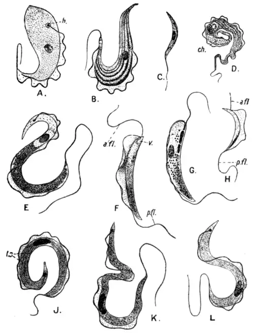 Bibliography.—A comprehensive review of the Haemoflagellates and allied parasites, considered up to the end of 1905, has been published by (1) H. M. Woodcock, Quart. Journ. Mic. Sci. (1906), 50, p. 150. The principal original papers referred to are: (Ia) A. Billet, “Culture d’un trypanosome de la grenouille chez une hirudinée,“ &c., C. r. ac. sci. (1904), 139, p. 574; (2) “Sur le Trypanosoma inopinatum de la grenouille verte d’Algérie et sa relation possible avec les Drepanidium,” C. r. soc. biol. (1904), 57, p. 161, figs; (3) 1. R. Bradford and H. G. Plimmer, “The Trypanosoma brucei, the organism found in Nagana or the Tsetse-Hy disease,” Quart. Journ. Mic. Sci. (1902), 45, p. 449, with pls; (4) D. Bruce, D. Nabarro and E. D. Greig (various reports on sleeping-sickness and other trypanosomoses in Uganda), Roy. Soc. Comm. (1903-1905), Nos. 1, 4 and 5; (5) E. Brumpt, “Contribution a l’étude de l’evolution des hémogregarines et des trypanosomes,” C. r. soc. biol. (1904), 57, p. 165; (5a) idem, “On the mode of transmission and development of Trypanosomes and Trypanoplasms in leeches,” C. r. soc. biol. (1906), 60, pp. 160, 162; and op. cit. (1906), 61, p. 77; (6) A. Castellani, “Trypanosoma and Sleeping-sickness,” Rep. Sleeping-sickness Comm. Roy. Soc. (1903), Nos. 1 and 2; (7) S. R. Christophers, “Reports on parasite found in persons suffering from enlargement of the spleen in India,” Sci. Mem. India (1904–1905), Nos. 8, 11 and 15; (8) Danilewsky, “Recherches sur la parasitologie comparée du sang des oiseaux (Kharkoff, 1888-1889); (9) D. Doflein, Die Protozoen als Parasiten und Krankheitserreger, (Jena [G. Fischer], 1901); (10) C. Donovan, “Human Piroplasmosis,” Lancet (1904), p. 744, 1 pl.; (11) E. Dutton, “Note on a Trypanosoma occurring in the Blood of Man, “Brit. Med. Journ. (1902), p. 881; (12) Dutton and J. L. Todd, “First Report of the Trypanosomiasis Expedition to Senegambia, 1902, “Mem. Livpl. Sch. Trop. Med. (1903) 11; (13) Gruby, “Recherches et observations sur une nouvelle espèce d’Hématozoaire (Trypanosoma sanguinis)” C. r. ac. sci. (1843), 17, p. 1134, also Ann. sci. nat. (1844), 3, i. p. 105, figs.; (14) W. Hanna, “Trypanosoma in Birds in India,” Quart. Journ. Mic. Sci. (1903), 47, p. 433, 1 pl.; (15) G. Keysselitz, “Über Trypanophis grobbeni (Trypanosoma grobbeni, Poche),” Arch. Protistenk. (1904), 3, p. 367, figs.; (16) idem, “Generations- und Wirthswechsel von trypanoplasma borreli, Lav. u. Mesnil,” op. cit. 7, p. 1, figs.; (16a) R. Koch, “Mittheilungen Uber den Verlauf der deutschen Expedition . . in Ostafrika,” Deutsch. med. Wochensch. (1906), app., p. 51; op. cit. (1907), p. 49; (17) F. Krzysztalowicz and M. Siedlecki, “Contribution à l’étude de la structure et du cycle évolutif de Spirochaete-pallida, Schaud.,” Bull. Ac. Cracovie (1905), p. 713, 1 pl.; (18) E. R. Lankester, “On Undulina, the type of a new group of Infusoria, “Quart. Journ. Mic. Sci. (1871), 11, p. 387, figs.; (19) “The Sleeping-sickness,” Quart. Rev. (July 1904), p. 113, figs.; (20) A. Laveran, “Sur un nouveau trypanosome des bovidés,” C. r. ac. sci. (1902), 134, p. 512; (21) idem, “Sur un trypanosome d’une chouette,” C. r. soc. biol. (1903), 55, p. 528, figs.; (22) idem, “Sur un nouveau trypanosome d'une grenouille,“ op. cit. (1904), 57, p. 158, figs.; (23) Laveran and F. Mesnil, “Recherches morphologiques et expérimentales sur le trypanosome des rats, Tr. Zewisi (Kent),” Ann. inst. Pasteur (1901), 15, p. 673, zpls.; (24) idem, “Des Trypanosomes des poissons, " Arch. Protistenk. (1902), 'I, p. 475, figs.; (25) idem, “Recherches morphologiques et expérimentales sur le trypanosome du Nagana ou maladie de la mouche tsé-tsé,” Ann. inst. Past. (1902), 16, p. 1, figs.; (26) idem, Trypanosomes et trypanosomiases (Paris [Masson et Cie], 1904); (27) idem, “Sur un protozoaire nouveau (Piroplasma donovani, Lav. et Mesn.) parasite d'une fièvre de l'Inde,” C. r. ca. sci. (1903), 137, p. 957, figs.; (28) idem, “Sur la nature bactérienne du prétendu trypanosome des huitres, T. balbianii,” C. r. soc. biol. (1901), 53, p. 883; (there are numerous other papers by these authors in the C. r. ac. sci. and the C. r. soc. biol. from 1900 onwards); (29) L. Léger, “Sur un flagellé parasite de l'Anopheles maculipennis,” C. r. soc. biol. (1902), 54, p. 354, figs.; (30) idem, “Sur la morphologie du trypanoplasma des vairons,” C. r. ac. sci. (1904), 138, p. 824; (31) idem, “Sur la structure et les affinités des trypanoplasmes” (1904), t. c. p. 856, figs.; (32) idem, “Sur les hémorflagellés du Cobitis barbatula, L. I. Trypanosoma barbatulae, n. sp.,” C. r. soc. biol. (1904), 57, p. 343; (33) idem, “Trypanoplasma varium, n. sp., parasite du sang de Cobitis barbatula, L.” (1904), t. c. p. 345; (34) idem, “Sur les affinités de l'Herpetomonas subulata et la phylogénie des trypanosomes” (1904), t. c. p. 615; (35) idem, “Sur la présence d'un trypanoplasma intestinal chez les poissons,” op. cit. (1905), 58, p. 511; (36) W. Leishman, “On the possibility of the occurrence of trypanosomiasis in India,” Brit. Med. Journ. (1903), i. 1252, figs.; (37) idem, “Note on the nature of the parasitic bodies found in tropical splenomegaly,” op. cit. (1904), i. 303; (38) Leishman and Statham, “The development of the Leishman body in cultivation,” Journ. Army Med. Corps (1905), 3, 14 pp., 1 pl.; (39) J. Lignières, “Contribution a l'étude de la trypanosomose des équidés sud-americains connue sous le nom de Mal de Caderas,” Rec. med. vet. (8) (1903), 10, p. 51, 2 pls.; (40) A. F. Mayer, “Spicilegium observationum anatomicarum de organo electric in raiis anelectrias et de haematozois,” (Bonn, 1873), 18, pp., pls.; (41) F. Mesnil, F. Nicolle and P. Remlinger, “Sur le protozoaire du bouton d'Alep,” C. r. soc. biol. (1904), 57, p. 167; (41a) E. A. Minchin, 