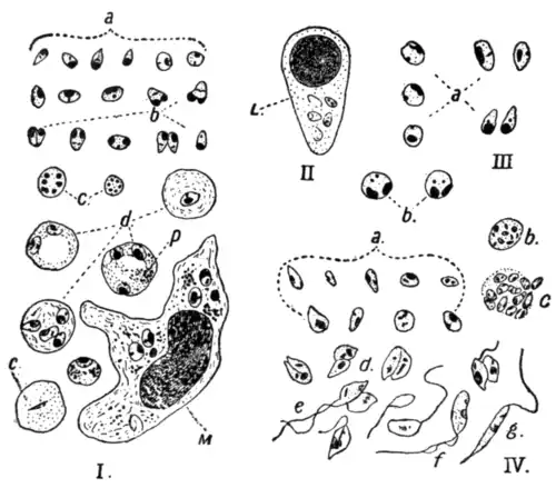 II. Uninuclear leucocyte (L) containing several parasites (after Lav. and Mesnil).
