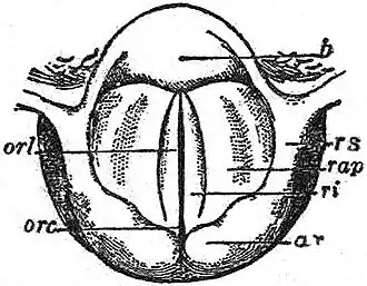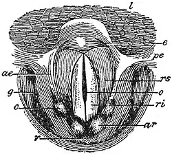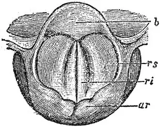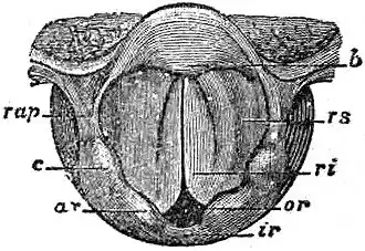 Fig. 7.—Arrangement of Glottis previous to Emission of a Sound. b, epiglottis; rs, false cord; ri, true vocal cord; ar, arytenoid cartilages. (From Mandl.) | ||