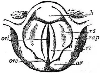 Fig. 9.—Chest Voice, Deep Tone. b, epiglottis; or, glottis; rs, false vocal cord: ri, true vocal cord; rap, ary-epiglottidean fold; ar, arytenoid cartilages. (From Mandl.) | ||