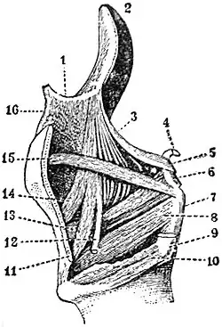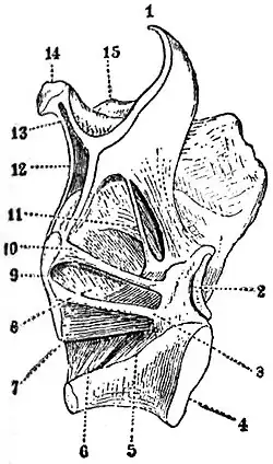 Fig. 2.—Cartilages and Ligament of Larynx, seen from behind; half nat. size. 1, epiglottis; 2, lesser cornu of hyoid bone; 3, greater cornu of hyoid; 4, lateral thyro-hyoid ligament; 5, cartilago triticea; 6, upper cornu of thyroid; 7, thyro-epiglottis ligament; 8, cartilages of Santorini; 9. arytenoid cartilages; 10, left lamina of thyroid; 11, muscular process of arytenoid cartilage; 12, inferior cornu of thyroid; 13, first ring of trachea; 14, posterior membranous wall of trachea; 15, lamina of cricoid cartilage. (From Krause.) | ||